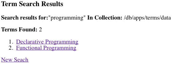 search. For our term manager application this would be/db/apps/term/search. There are two functions stored here. A simple HTML search form (search.html) and a RESTful search (service.xq). Advanced applications sometimes combine these functions into a single XQuery that generates HTML.In addition to these two search functions, an additional collection configuration file, called
