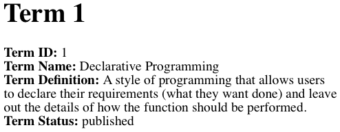 In this example we will use a simple registry of business terms that might be used in a glossary of terms on a web site. Each term will have (1) a numeric ID, (2) a term name, (3) a definition, and (4) a publish-status code of "draft," "under-review," or "published."